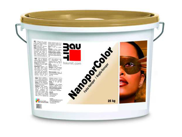 NanoporColor z oferty firmy Baumit jest mineralną farbą na bazie szkła wodnego – silikatu, modyfikowaną nanocząsteczkami i przeznaczoną do dekoracyjnego wykończenia fasady, jak również wnętrz. Specjalnie opracowana receptura, mikrostruktura powierzchni oraz specjalny dodatek nanokrystaliczny i nieorganiczny powodują, że powierzchnie malowane farbą NanoporColor posiadają zdecydowanie większą odporność na zabrudzenia niż powierzchnie pokryte innymi powłokami.
