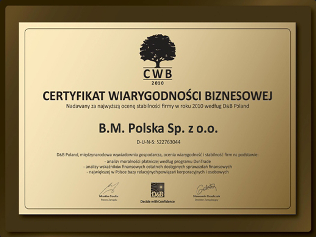 Certyfikat Wiarygodności Biznesowej to prestiżowe wyróżnienie przyznawane przez międzynarodową firmę Dun & Bradstreet, która specjalizuje się w sporządzaniu raportów handlowych na temat firm na całym świecie Od 170 lat dostarcza ona usługi i wiedzę niezbędne do podejmowania pewnych i bezpiecznych decyzji biznesowych. Certyfikat Wiarygodności Biznesowej przyznawany jest wyłącznie firmom, których dane finansowe dają gwarancję wysokiego poziomu rentowności, zdolności i płynności finansowej, a poziom zadłużenia oraz zarejestrowanych przeterminowanych płatności jest znikomy. Podstawą do oceny firmy jest analiza moralności płatniczej według programu DunTrade®, analiza wskaźników finansowych ostatnich dostępnych sprawozdań finansowych oraz największa w Polsce baza relacyjnych powiązań korporacyjnych i osobowych. Certyfikat Wiarygodności Biznesowej stanowi gwarancję, że jego właściciel jest wiarygodnym kontrahentem, z którym warto nawiązywać kontakty handlowe. Wyróżnienie przyznawane przez Dun & Bradstreet Poland, honorowane jest na całym świecie i przyczynia się do zwiększenia atrakcyjności rynkowej firmy.