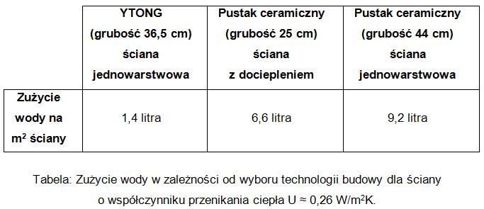 Zużycie wody zależy do wybranej technologii budowy. Przy zachowaniu takiego samego parametru izolacyjności cieplnej U≈0,26 W/m2K do wymurowania 1m2 ściany możemy potrzebować od 1 do 10 litrów wody.