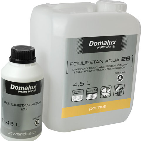 Poliuretan Aqua 2S to lakier o wysokiej twardości (min. 170). Jest odporny na ścieranie i zarysowania, a dzięki szczelnym wiązaniom międzycząsteczkowym zapewnia także dobrą ochronę parkietu przed chemią gospodarstwa domowego i przypadkowymi plamami (detergenty, wino, napoje gazowane itp.). Lakier charakteryzuje się krótkim czasem schnięcia (pyłosuchość w 1,5 godziny) i wysoką elastycznością powłoki. Jego wydajność przy jednej warstwie wynosi 8-10 m2. Dwuskładnikowy Domalux Professional jest także bezpieczny dla zdrowia i środowiska (NMP free) i odporny na ślady obuwia BHMR. Czas schnięcia lakieru wynosi od 4 do 8 godzin. Produkt dostępny jest w wersji połysk i półmat.