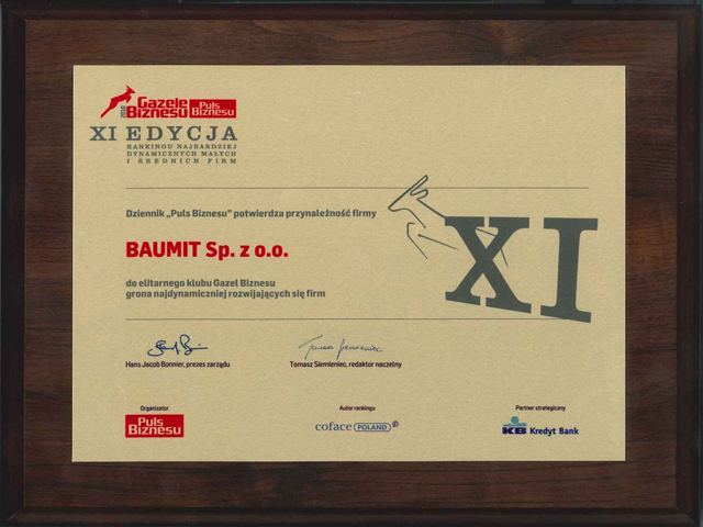 Baumit po raz trzeci został uhonorowany prestiżowym tytułem Gazela Biznesu 2010. Konkurs organizowany przez Puls Biznesu przy współpracy z firmą Coface Poland i pod patronatem Krajowej Izby Gospodarczej docenia przedsiębiorstwa, które z roku na rok notują wzrost przychodów, a także mogą poszczycić się rynkowym sukcesem.