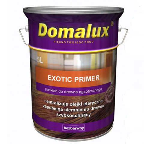 Domalux Exotic Primer lakier podkładowy do drewna egzotycznego. Podkład wiążący na bazie alkoholu przeznaczony do gruntowania drewna egzotycznego. Minimalizuje wypłukiwanie olejków i barwników z drewna. Stosowany do drewna egzotycznego i krajowego, zapobiega jego ciemnieniu pod wpływem poliuretanowych lakierów nawierzchniowych. Czas schnięcia 4 h. Liczba warstw: 1 (wałek, pędzel) lub 2 (blacha parkieciarska). Wydajność z 1 litra do 10 m². Produkt dostępny jest w opakowaniach 1l i 5l.