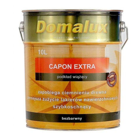 Domalux Capon Extra - nitrocelulozowy podkład wiążący przeznaczony do gruntowania podłóg o nawierzchni z drewna krajowego. Stabilizuje luźne cząstki drewna i poprawia związanie poliuretanowych lakierów nawierzchniowych z podłożem drewnianym. Zmniejsza zużycie lakierów nawierzchniowych, zapobiega ciemnieniu drewna (co jest istotne szczególnie przy malowaniu drewna dębowego i bukowego). Czas schnięcia 4 h. Jedna lub 2 warstwy. Wydajność z 1 litra 10-12 m². Produkt dostępny jest w opakowaniach 0,5 l, 1 l, 5 L oraz 10 l.