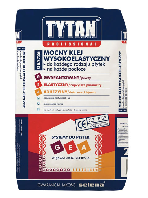 Zakup dobrej jakości płytek to tylko połowa sukcesu – należy jeszcze dobrać odpowiedni klej, kierując się przy tym rodzajem okładziny i charakterem podłoża. Mocny klej wysokoelastyczny GEA736 został wyprodukowany na bazie najwyższej jakości, idealnie zbalansowanych komponentów. Za gwarancją najlepszych parametrów przemawia fakt, że spełnia on najnowszą normę europejską PN - EN 12004:2008. Ze względu na zoptymalizowane cechy fizyko-chemiczne Mocny klej wysokoelastyczny GEA736 przejdzie test jakości w każdej sytuacji budowlanej. Ten profesjonalny produkt daje nam pewność, że kamienne płytki - nawet dużego formatu, nie będą się odspajać, zaś okładzina ceramiczna nie popęka.