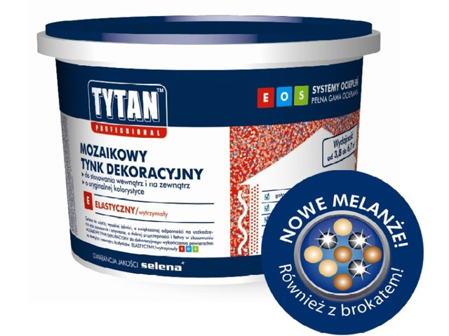Właściwości fizyko-chemiczne nowych w ofercie firmy Selena Tynków Mozaikowych zostały potwierdzone również w Aprobacie Technicznej ITB AT-15-7286/2011 wystawionej przez Instytut Techniki Budowlanej dla Zestawu wyrobów do wykonywania ociepleń ścian zewnętrznych budynków systemem TYTAN ES. Mozaikowe tynki dekoracyjne TYTAN EOS doskonale sprawdzają się w miejscach szczególnie podatnych na wycieranie, zabrudzenia i powstawanie uszkodzeń, takich jak: korytarze, lamperie, klatki schodowe, ściany przy balkonach i wejściach czy wokół kominków. Produkty systemu ES (ELASTYCZNY/SAMOCZYSZCZĄCY) charakteryzuje odporność na uderzenia, zadrapania i zabrudzenia, jak również na działanie warunków atmosferycznych i wody. Ze względu na swoje właściwości elastyczne tynki mozaikowe TYTAN EOS pozwalają na mostkowanie istniejących w podłożu rys. Dzięki bardzo dobrej przyczepności są łatwe w nakładaniu na każde podłoże, m.in. tynki cementowo-wapienne, beton, płyty gipsowo-kartonowe, drewnopodobne czy warstwy zbrojeniowe w systemach ociepleń TYTAN EOS. Tynki mozaikowe TYTAN EOS z dodatkiem brokatu lub w wersji metalicznej, ułożone na elewacjach lub nasłonecznionych ścianach wewnętrznych pozwalają uzyskać intrygujący efekt gry świateł. Możliwości kolorystyczne nie ograniczają się jednak do gamy podstawowej ponad 120 melanży. Istnieje możliwość mieszania monokolorowych ziarenek o granulacjach 1 mm lub 1,5 mm, co daje niemal nieskończone możliwości kolorystycznej aranżacji ścian zewnętrznych i wewnętrznych.