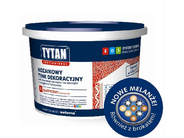 Realizację stylowej koncepcji wykończenia wnętrza lub elewacji umożliwia rozszerzony wybór z ponad 120 bazowych mieszanek kolorystycznych mozaikowych tynków dekoracyjnych TYTAN EOS. Nowe tynki mozaikowe z dodatkiem brokatu i w wersji metalicznej nadadzą wykańczanym ścianom ekskluzywnego połysku. Ułożone na elewacjach lub nasłonecznionych ścianach wewnętrznych pozwalają uzyskać intrygujący efekt gry świateł. Możliwości kolorystyczne nie ograniczają się jednak do gamy podstawowej - opcja mieszania monokolorowych ziarenek melanżu o granulacjach 1 mm lub 1,5 mm daje niemal nieskończone możliwości kolorystycznej aranżacji ścian zewnętrznych i wewnętrznych.