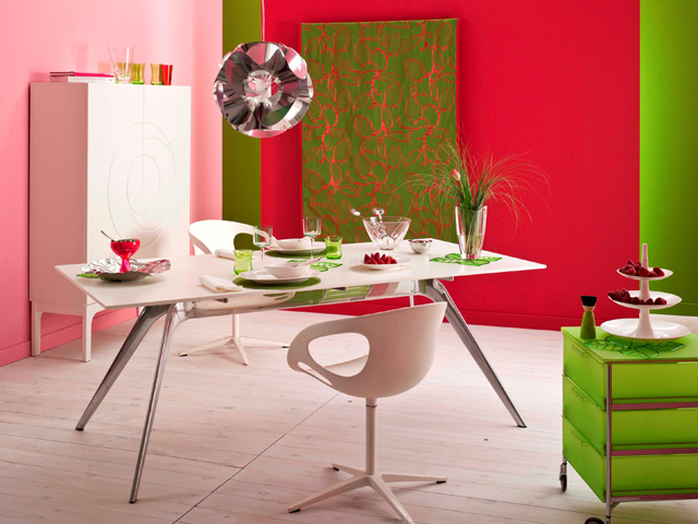Róż, czerwień i zieleń ścian w jednym wnętrzu – czemu nie? W połączeniu z jasną podłogą i białymi meblami powstaje oryginalna i bardzo wiosenna aranżacja.