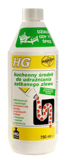 HG kuchenny środek do udrażniania zatkanego zlewu dzięki zawartości naturalnych enzymów i mikrobów rozpuszcza uciążliwe zatory z zalegających w rurach resztek pożywienia i tłuszczu. Jest bezpieczny dla środowiska naturalnego gdyż ulega całkowitej biodegradacji. Przed zastosowaniem preparatu, należy usunąć jak najwięcej wody z umywalki. Następnie wlać około 300 ml środka do odpływu i odczekać kilka godzin. HG kuchenny środek do udrażniania zatkanego zlewu może być stosowany do wszystkich rodzajów przewodów odpływowych oraz zbiorników septycznych.