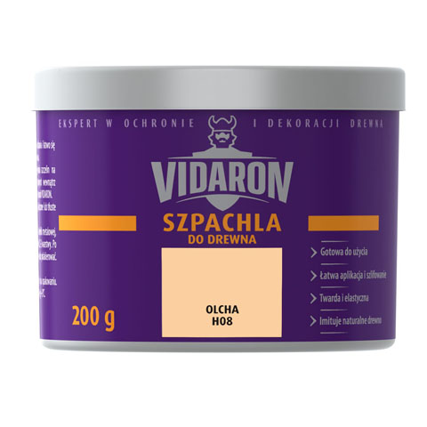 VIDARON Szpachla do drewna zawiera terpentynę, która decyduje o bardzo dobrej przyczepności masy szpachlowej do drewna, a specjalnie przygotowana mączka kwarcowa nadaje jej odpowiednią twardość i ułatwia dalszą obróbkę. Jest produktem gotowym do użycia, nie pęka podczas wysychania, łatwo się szlifuje i poleruje. Po przeszlifowaniu uzyskujemy gładkie powłoki w kolorze imitującym naturalną barwę drewna.
