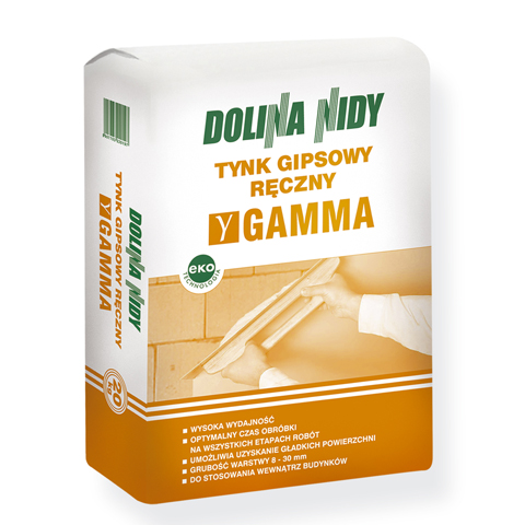 Tynk Gipsowy Ręczny GAMMA jest nowoczesną mieszanką, produkowaną na bazie gipsu syntetycznego oraz wypełniaczy mineralnych i dodatków chemicznych. Zaprawa uzyskana po wymieszaniu mieszanki z wodą jest bardzo wydajna, plastyczna, łatwa w obróbce. Odznacza się dobrą przyczepnością do podłoża. Czas obróbki zaprawy tynkarskiej dobrany jest optymalnie dla ręcznej technologii wykonywania tynków gipsowych. Powierzchnia gotowego tynku jest równa, gładka, twarda i stanowi doskonałe podłoże pod malowanie, tapetowanie lub układanie okładzin ceramicznych. Zastosowanie tynku gipsowego zapewnia korzystny mikroklimat w pomieszczeniach, pozytywnie wpływający na zdrowie i samopoczucie człowieka. Warstwa tynku charakteryzuje się również parametrami korzystnymi pod względem izolacyjności cieplnej i akustycznej. Jest też całkowicie niepalna.