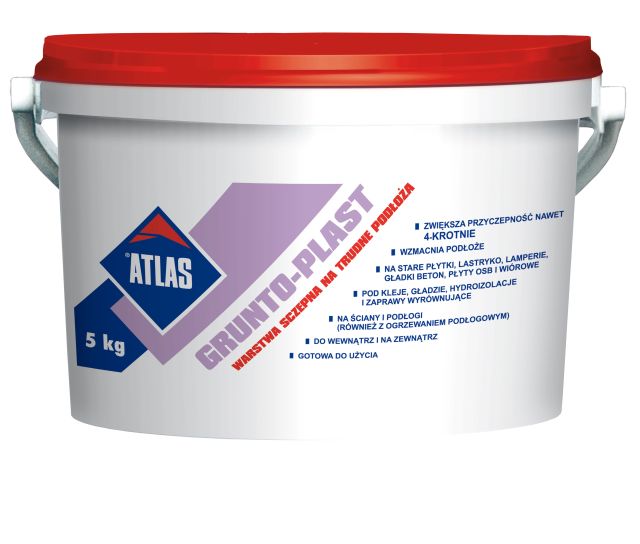 Atlas Grunto-Plast to uniwersalny super grunt na trudne podłoża. Umożliwia trwałe przyklejanie płytek na betonie, lastryko, lamperiach, starych okładzinach ceramicznych, a nawet na płytach drewnopochodnych (w tym płyty OSB). Jednocześnie można go stosować jako grunt na płyty g-k, tynki gipsowe, cementowe, nieotynkowane ściany z wszelkiego rodzaju cegieł, bloczków, pustaków, na wylewki betonowe i anhydrytowe, a także pod hydroizolacje.