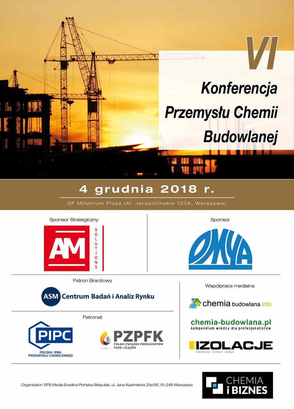 Przed nami VI edycja Konferencji Przemysłu Chemii Budowlanej. Wzorem poprzednich edycji, znów objęliśmy patronat nad wydarzeniem i już dziś zapraszamy 4.12.2018 r. do GF Millenium Plaza (Al. Jerozolimskie 123A, Warszawa).