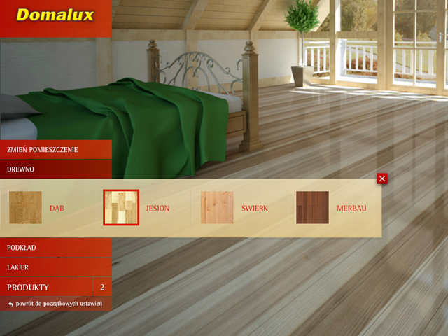 Aplikacja jest bardzo prosta i intuicyjna w użyciu. W pierwszej kolejności wybieramy pomieszczenie, które chcemy polakierować. Do wyboru mamy cztery typy pomieszczeń o różnej intensywności użytkowania podłogi: salon, sypialnię, hol ze schodami lub salę sportową. Następnie wybieramy gatunek drewna, z którego ułożona jest podłoga. Program umożliwia wybór jednego z czterech najpopularniejszych gatunków drewna: dębu, jesionu, świerku i merbau. Kolejnym krokiem jest wybór lakieru podkładowego. Każdy podkład inaczej wpływa na barwę drewna i tym samym na końcowy efekt wizualny. Na końcu wybieramy lakier nawierzchniowy (jego typ: mat, półmat, bądź połysk), a aplikacja automatycznie dopasowuje produkty polecane do wybranych gatunków drewna i pożądanych efektów dekoracyjnych. W menu bocznym pojawia się informacja na temat produktów, a podłoga na ekranie zmienia wygląd. Dzięki wizualizerowi obliczymy także spodziewane zużycie lakieru. Wystarczy podać powierzchnię lakierowanej podłogi i odczytać prognozowane zużycie na jedną warstwę dla każdego z pasujących do naszej podłogi lakierów.